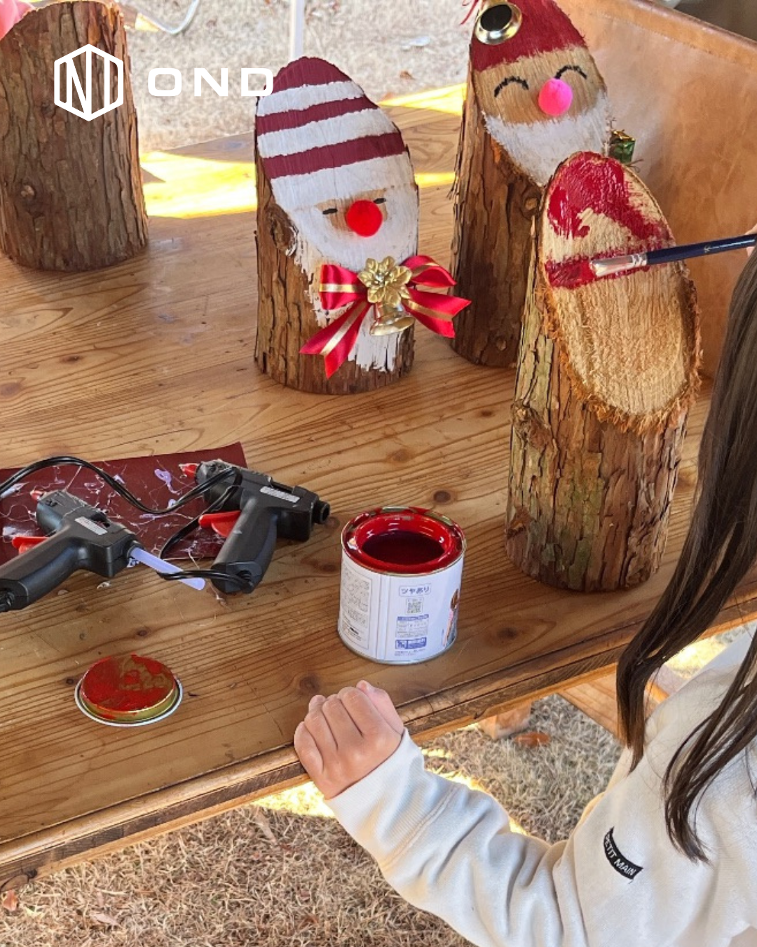 お気に入りの木材を選ぶところから始まり、色を塗ったりグルーガンで飾りをつけたりして、自分だけのオリジナルサンタができました。