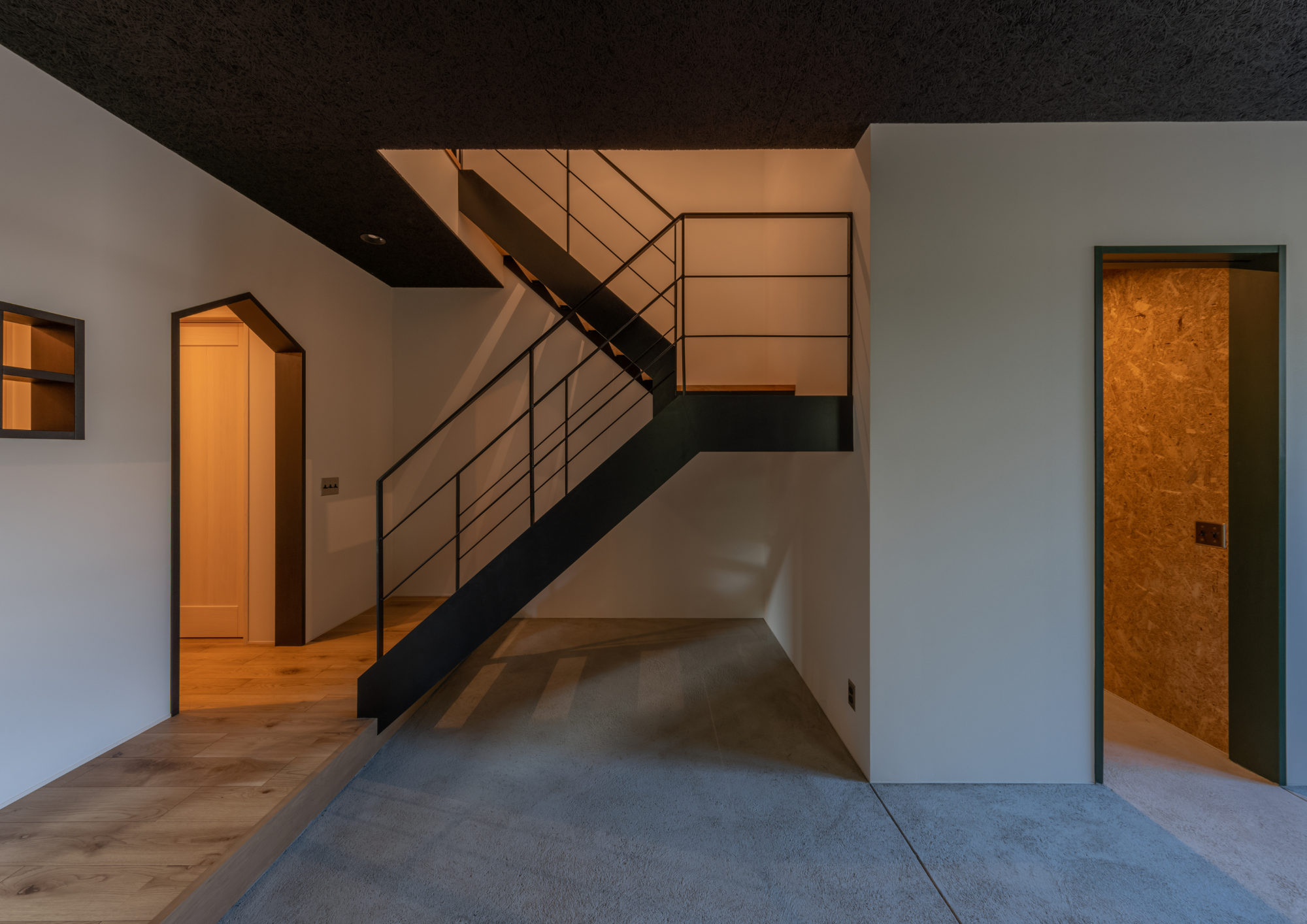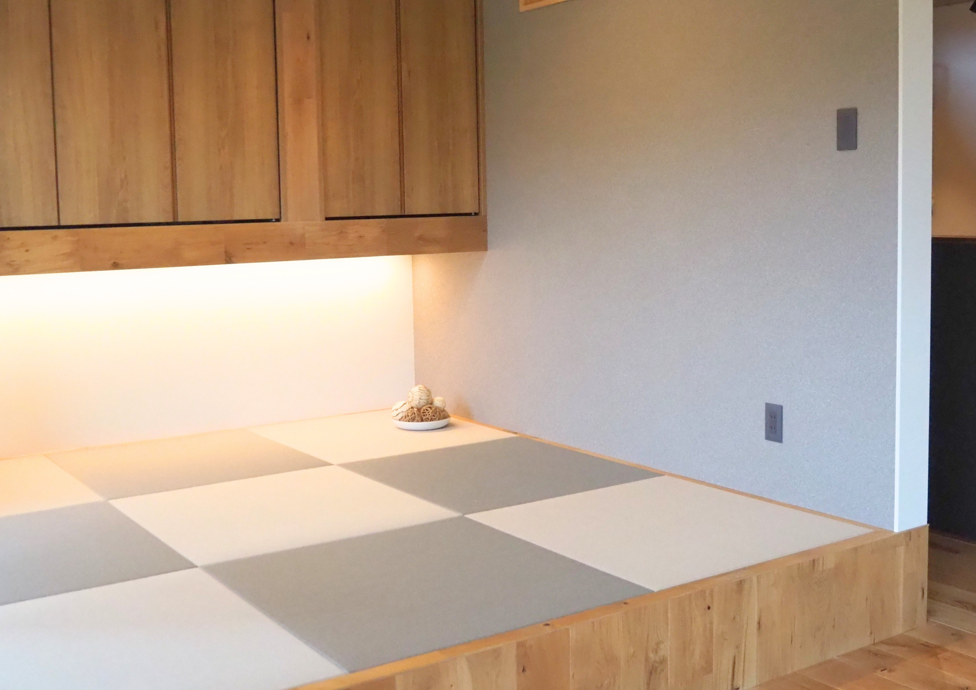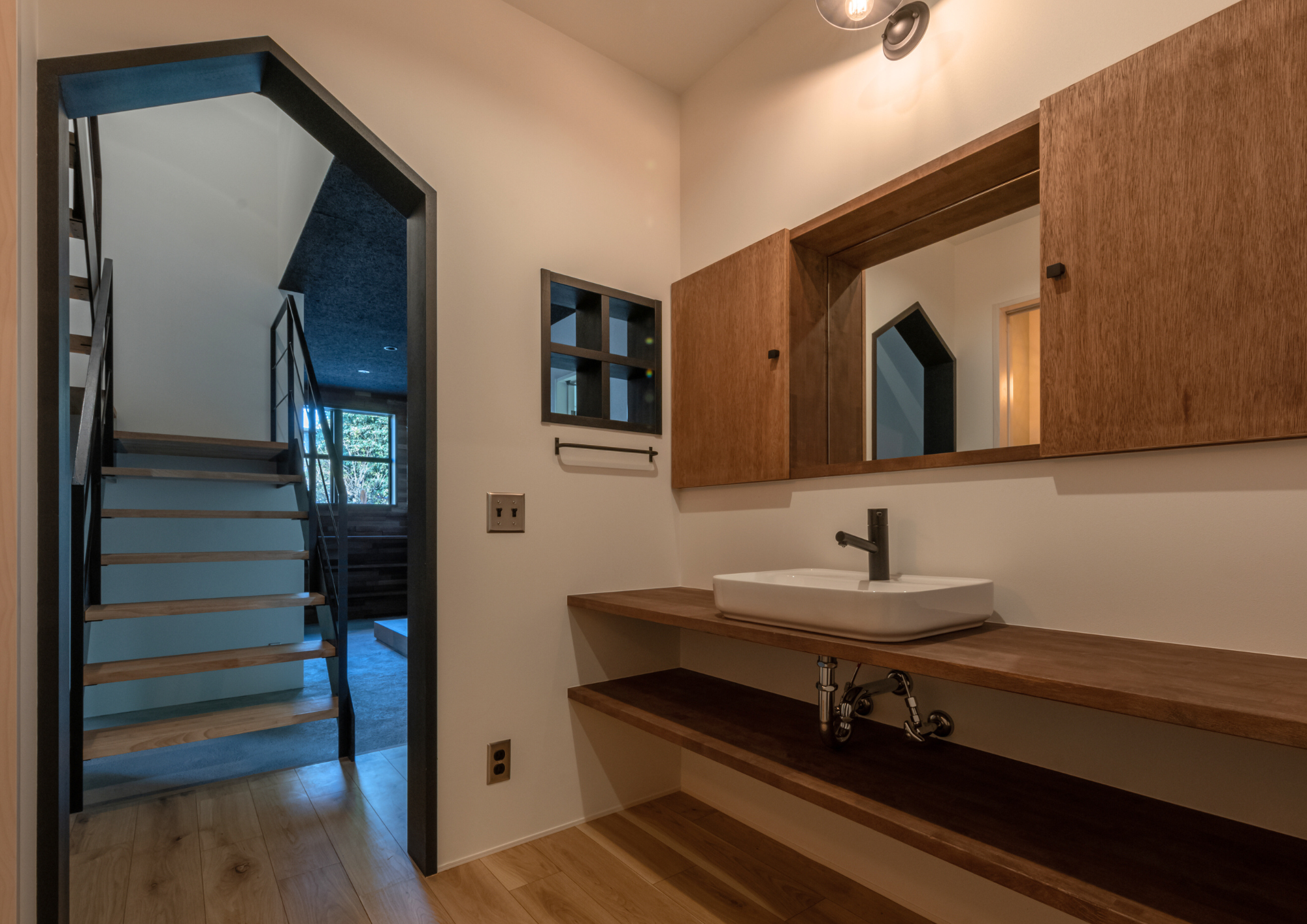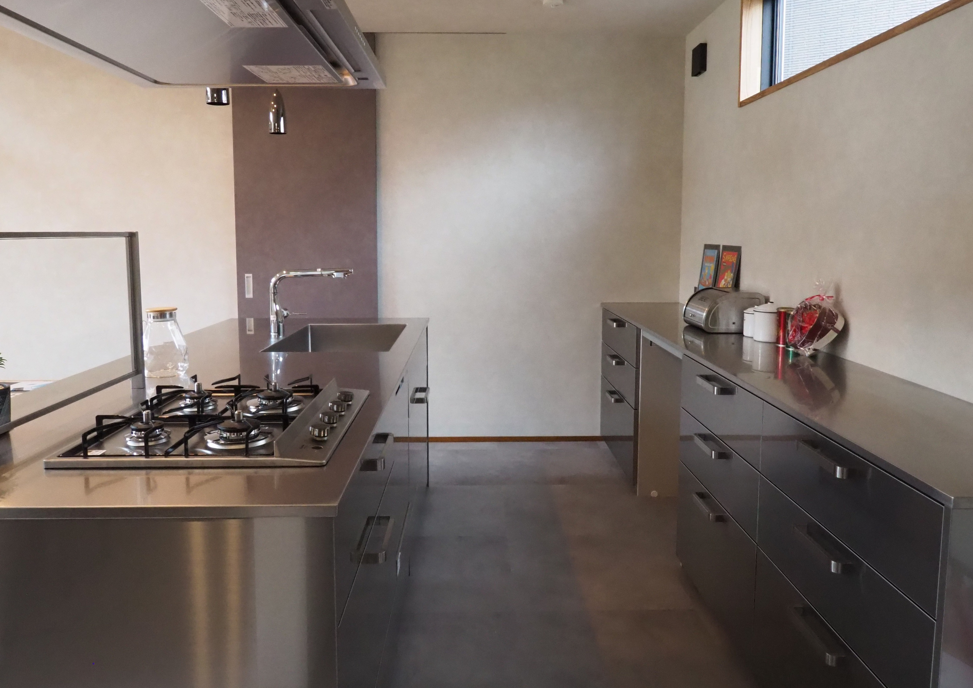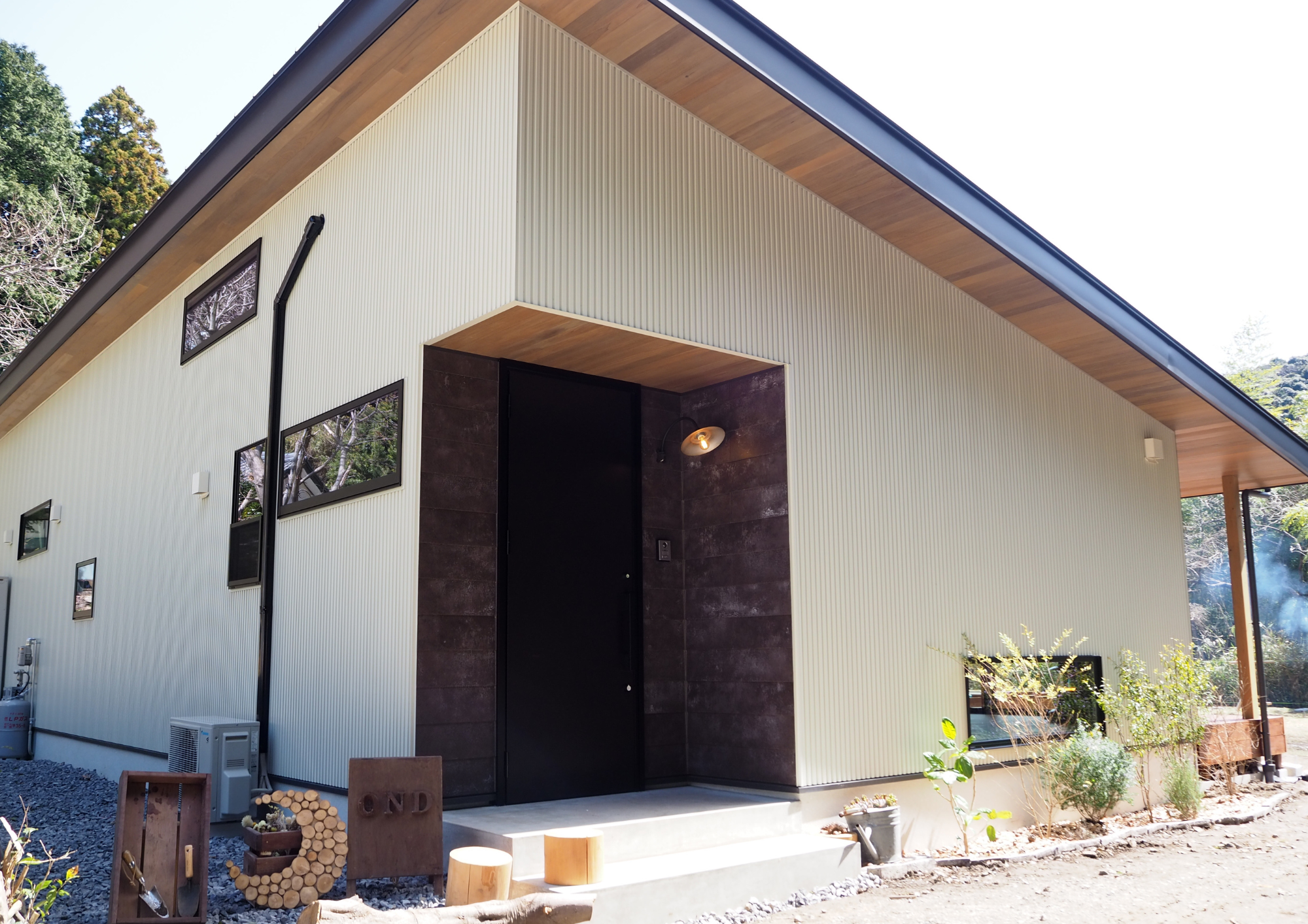 お母さまのために1階にミニキッチンとお風呂、サーフィンがご趣味の施主様のためにOSBボードを使用したかっこいい土間収納を造りました。