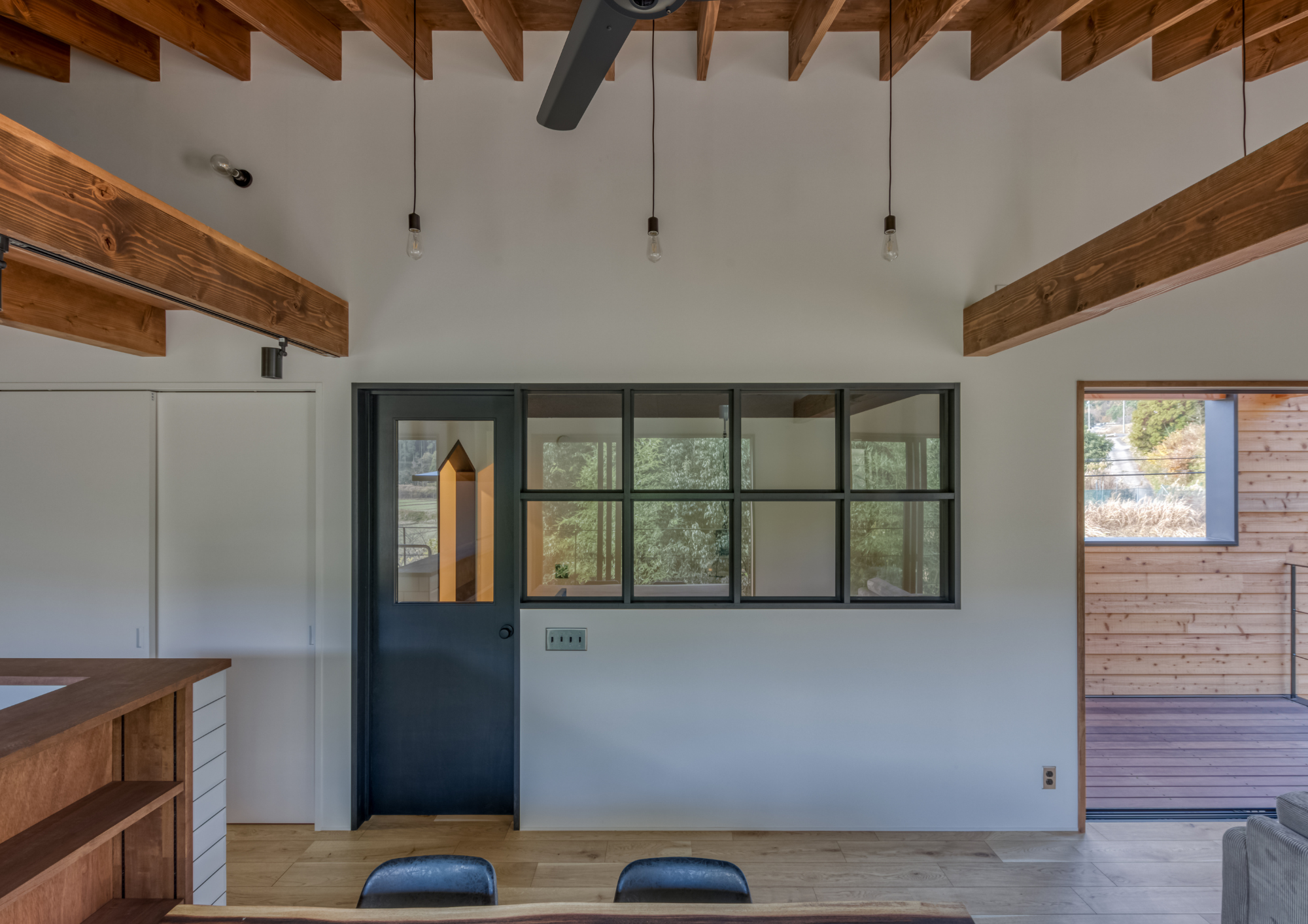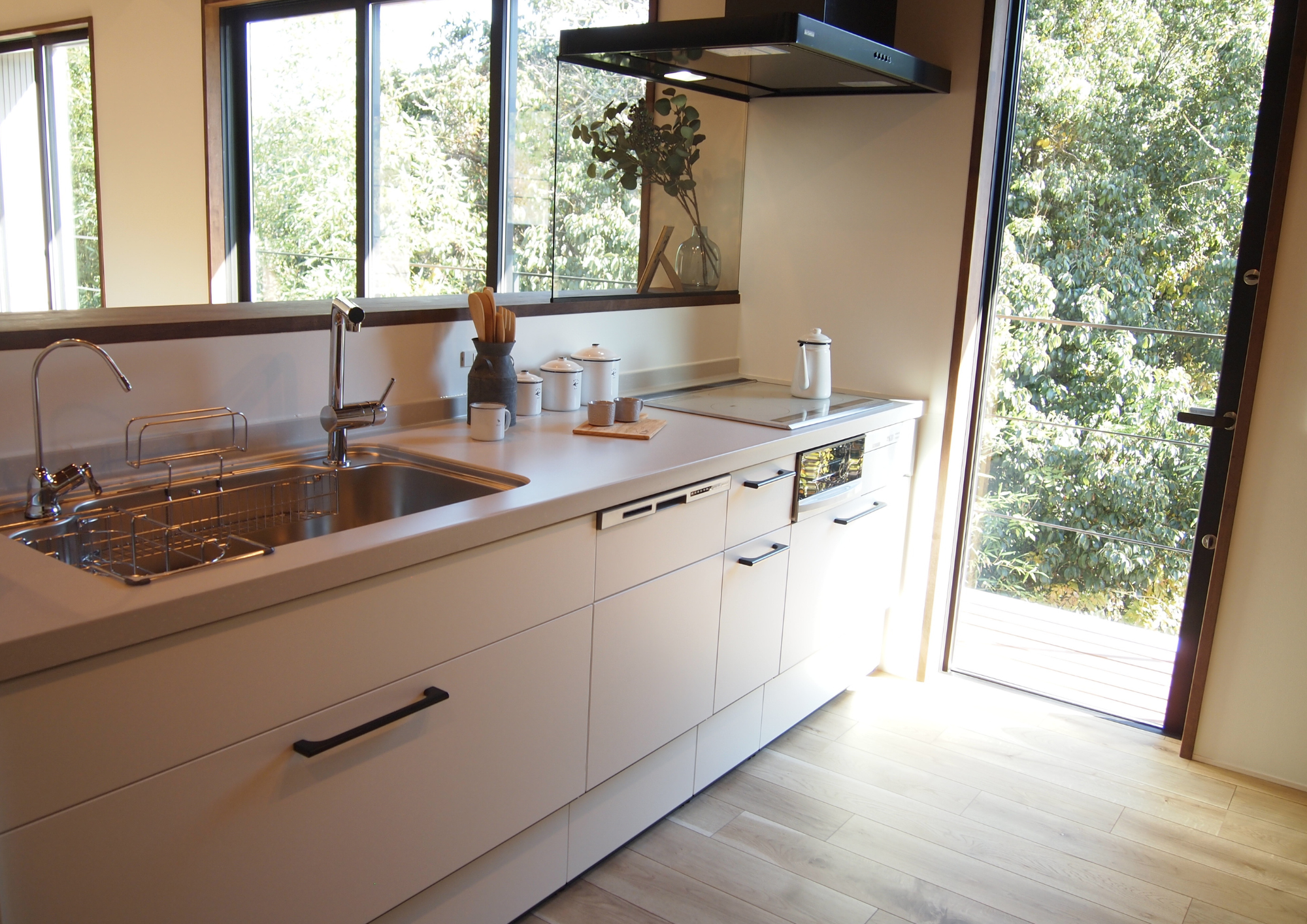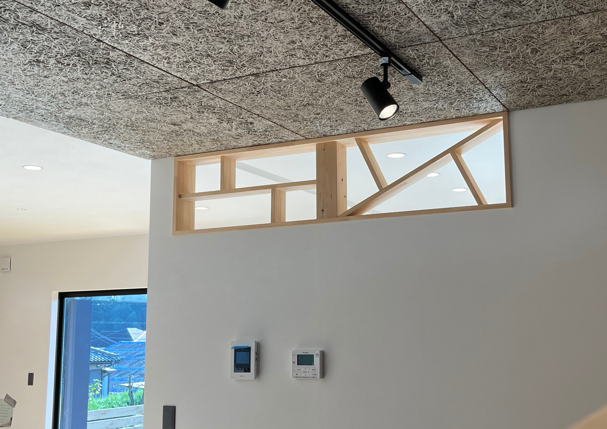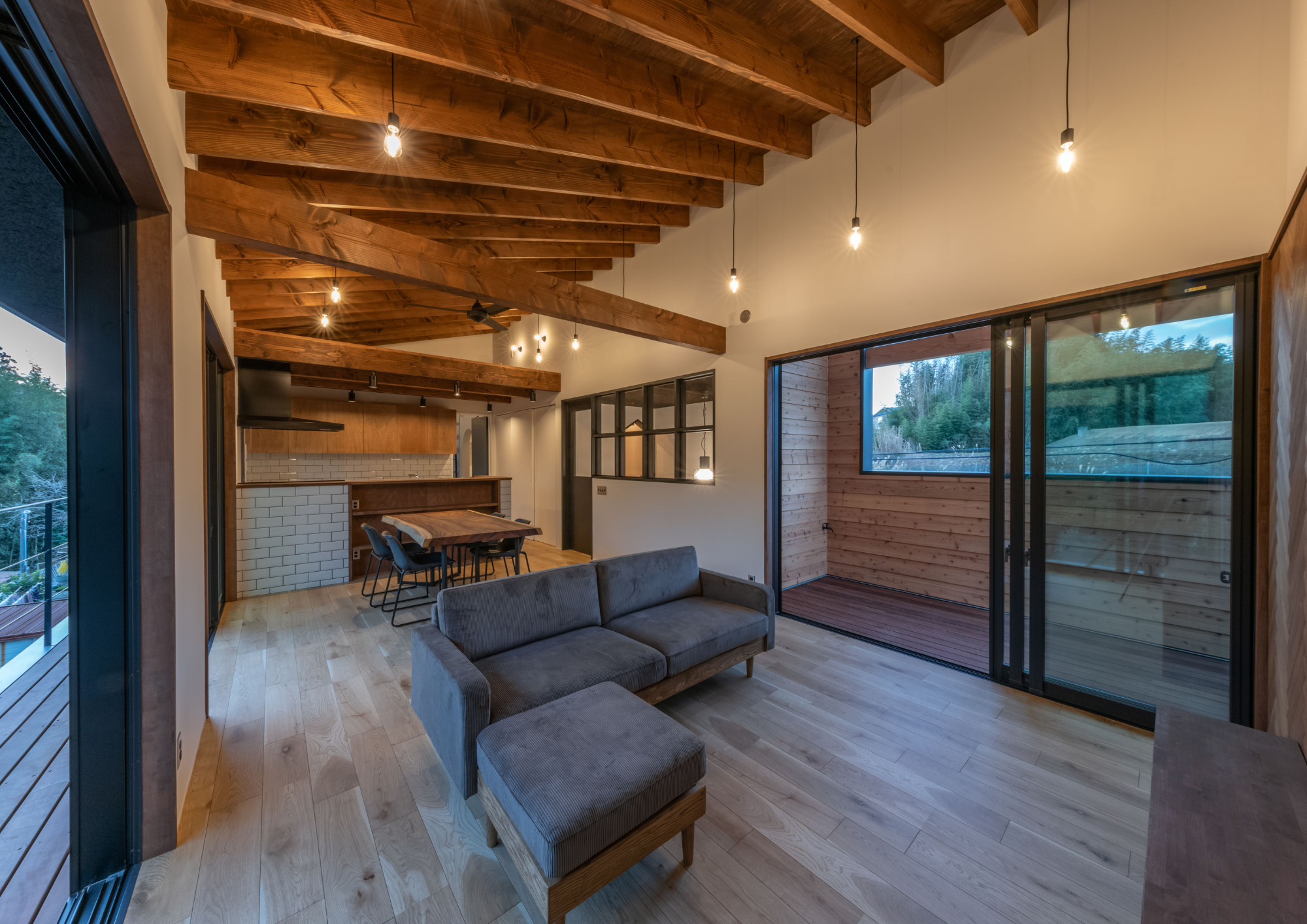 お母さまのために1階にミニキッチンとお風呂、サーフィンがご趣味の施主様のためにOSBボードを使用したかっこいい土間収納を造りました。