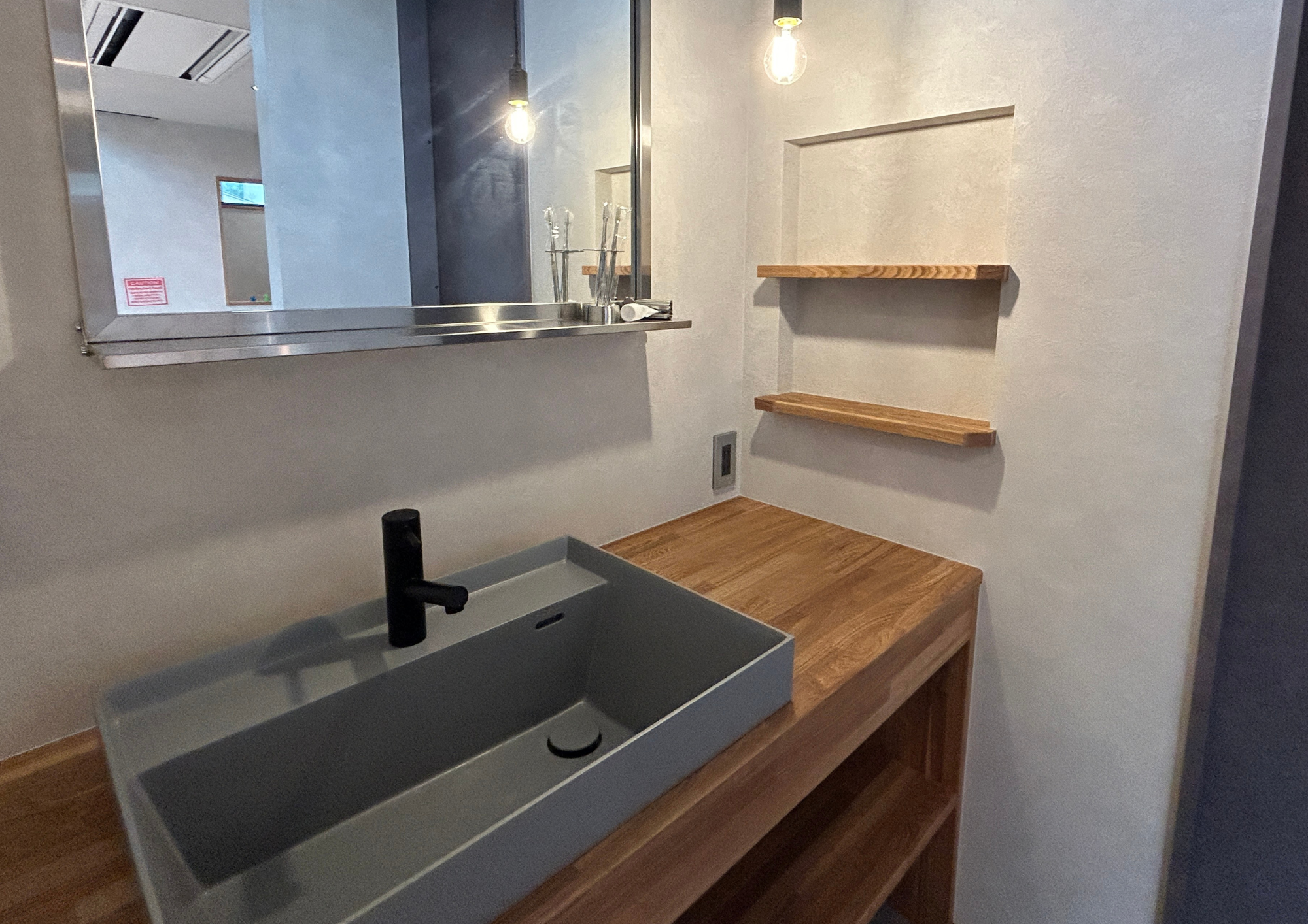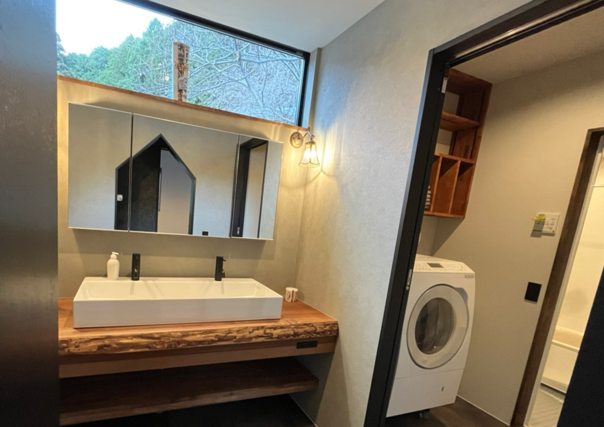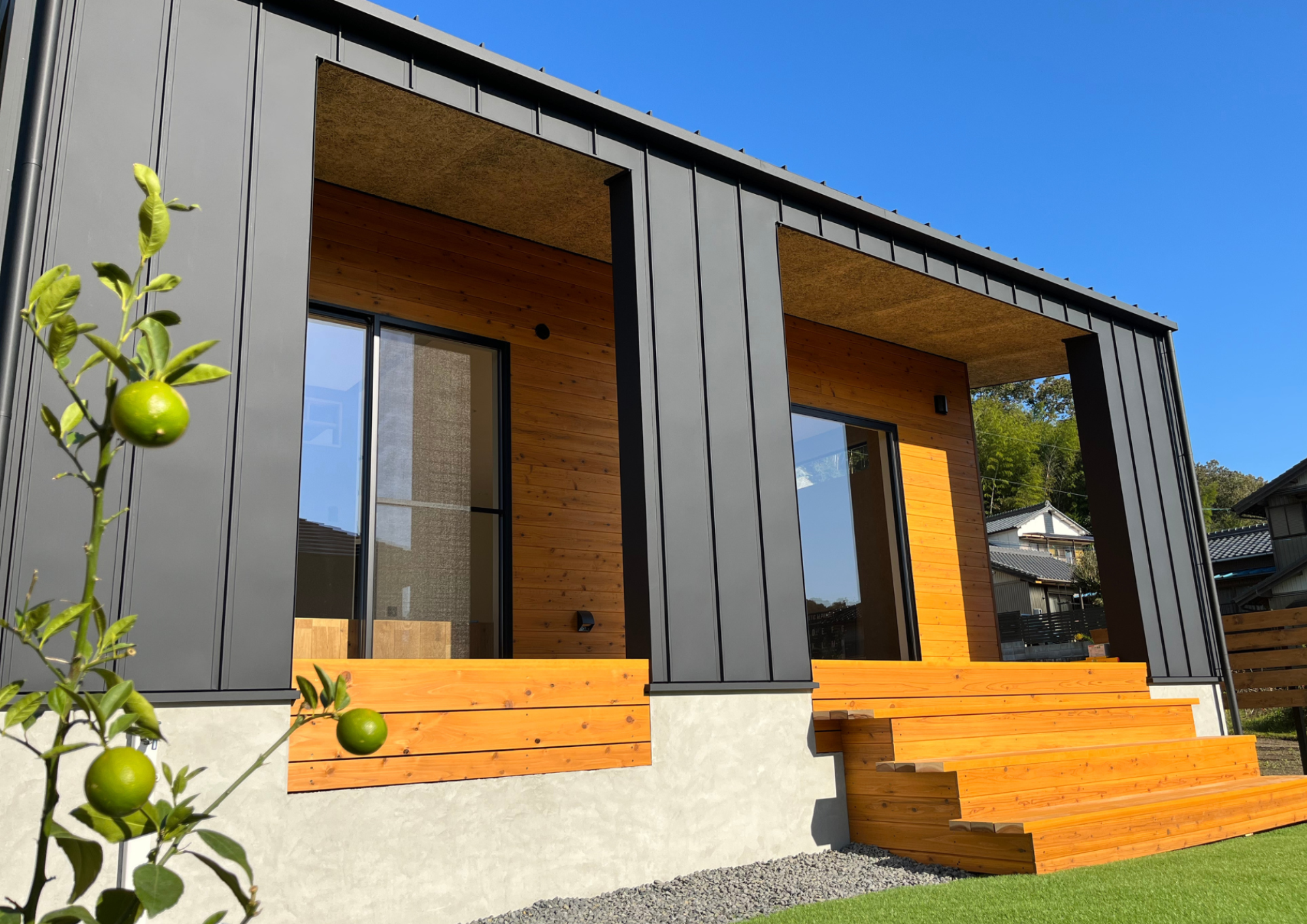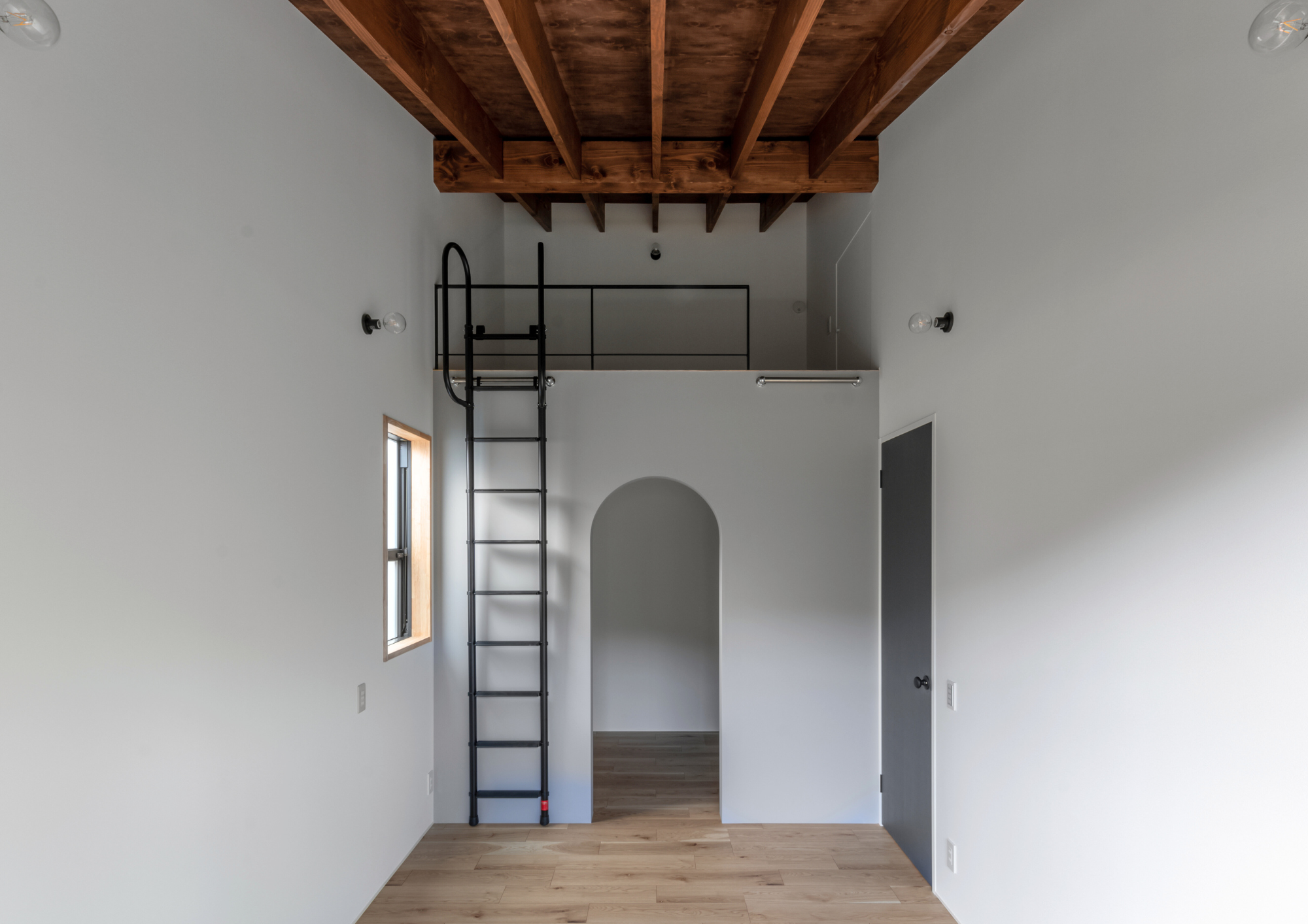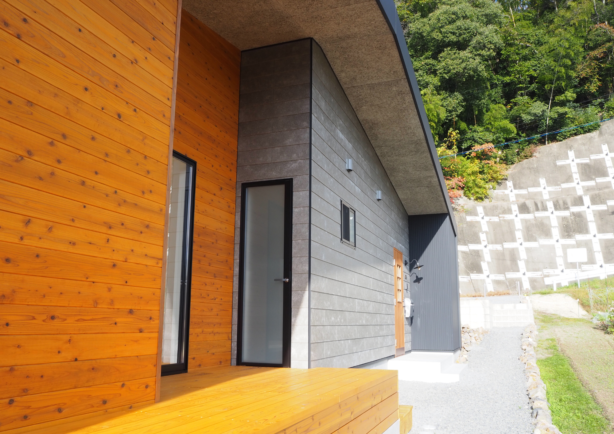 お母さまのために1階にミニキッチンとお風呂、サーフィンがご趣味の施主様のためにOSBボードを使用したかっこいい土間収納を造りました。