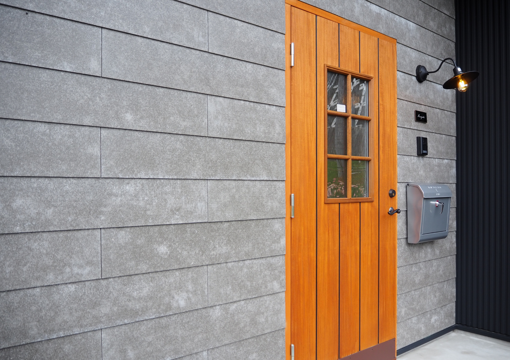 「自慢できるかっこいいおうち」をご希望されていた施主様、アメリカ製の玄関扉(ユーズド)を造作し、ヴィンテージ感のあるイメージに仕上げています。