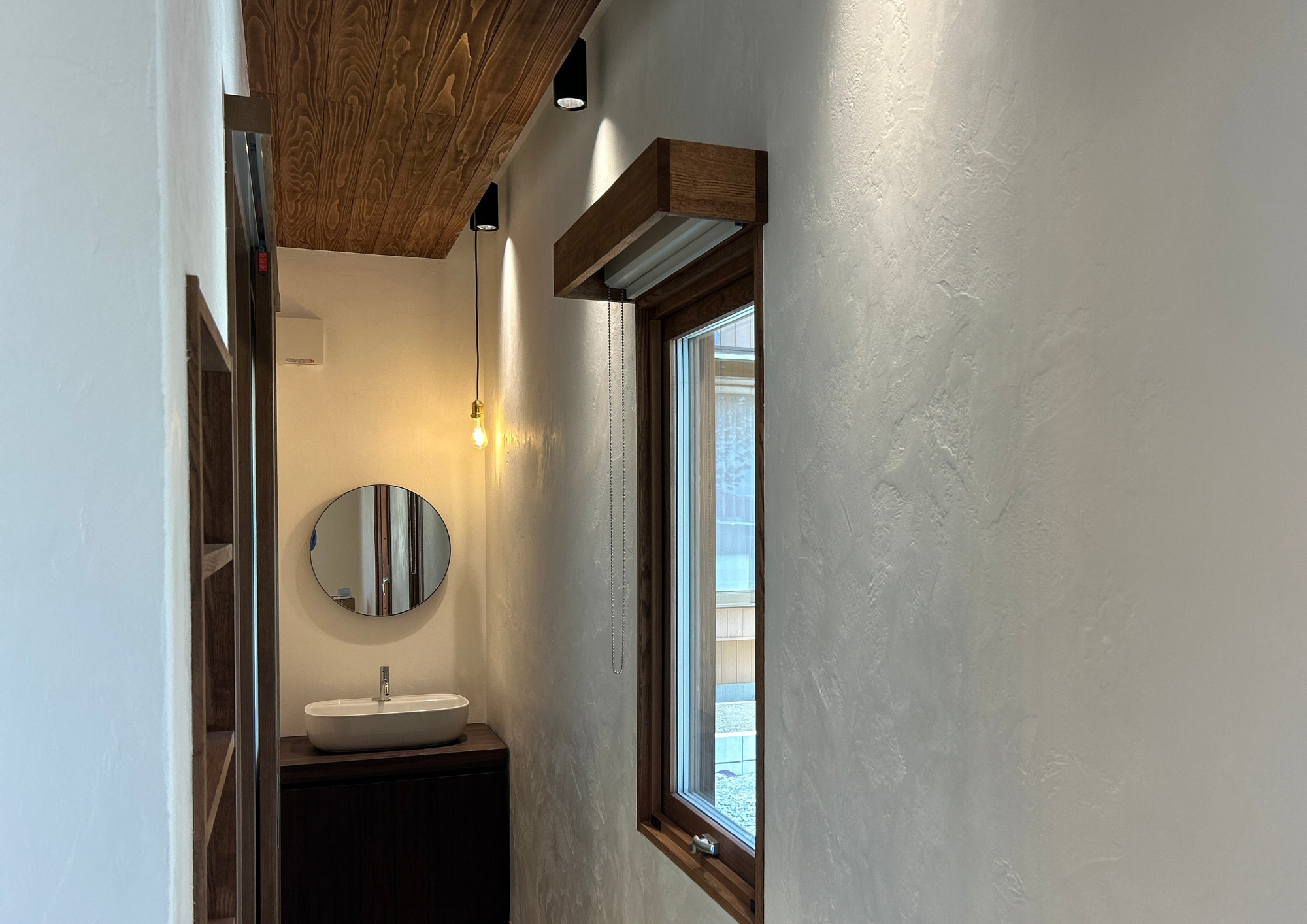 店舗の奥に配置したのは、木の温もりとモダンなデザインを掛け合わせた「造作洗面台」です。清潔感のあるホワイトの「ベッセル型洗面ボウル」に、柔らかな印象を与える「円形ミラー(丸鏡)」を組み合わせました。職人が手作業で仕上げた「漆喰の塗り壁」が、ペンダントライトの光を優しく反射し、小さなお手洗いスペースを上質な空間へと変えています。