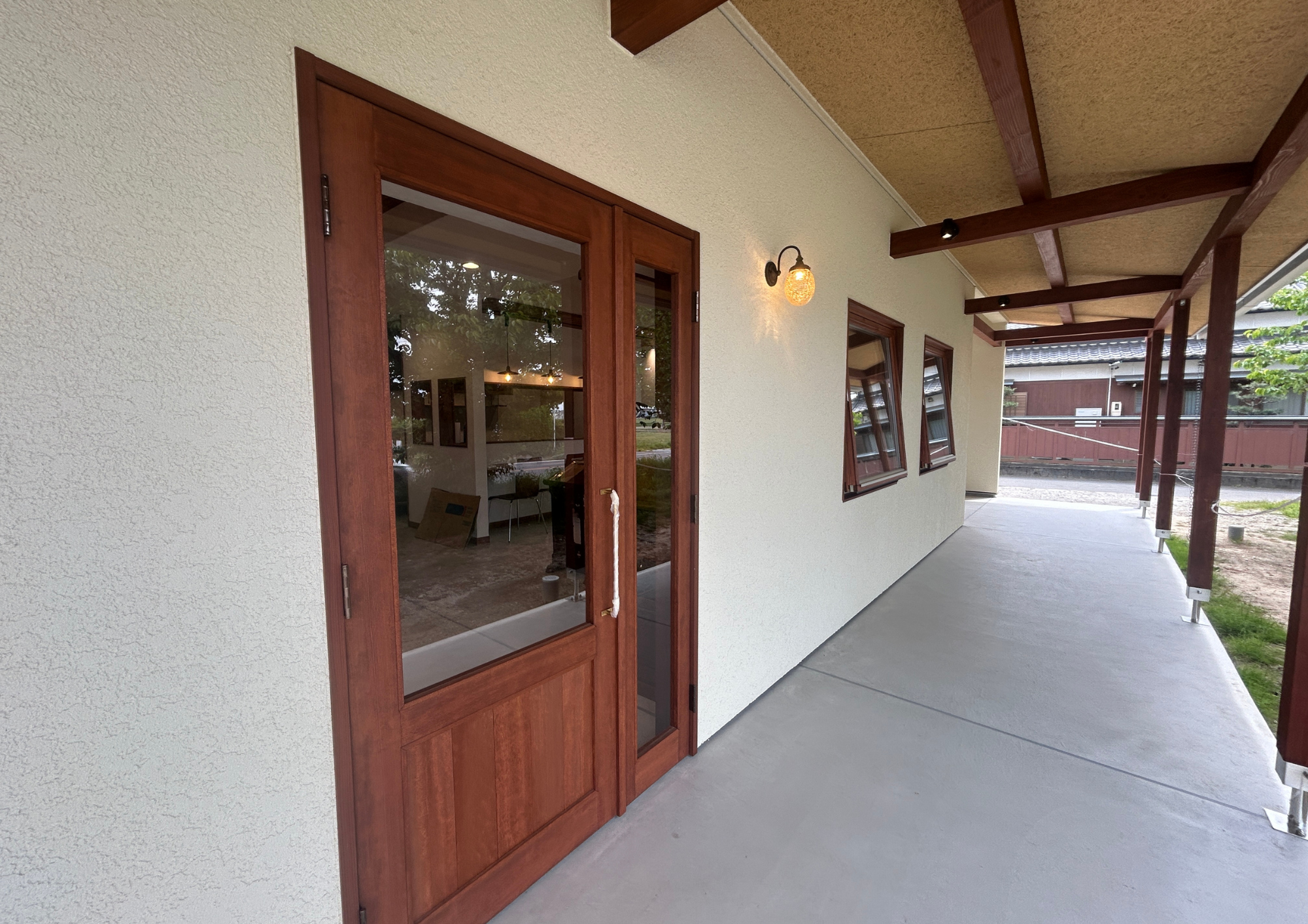 緩やかなカーブが描くアプローチと、素朴な木の柵。建物に辿り着くまでの数メートルを、季節を感じる特別な時間へと変える設計です。