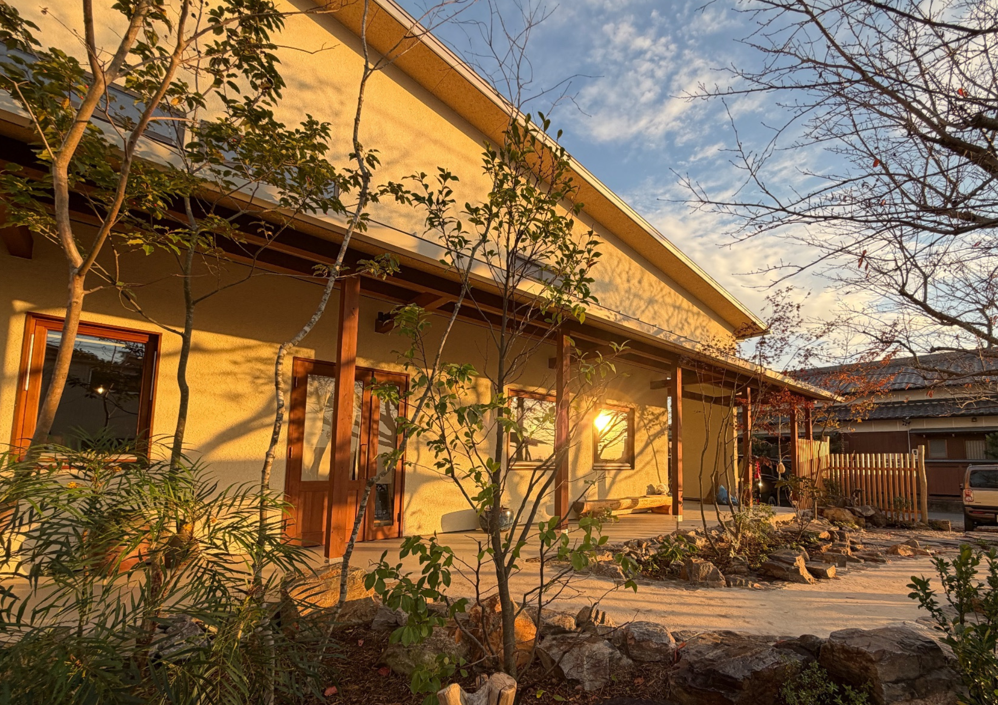 木製サッシから漏れる温かな灯りが、夕日に染まる「石積みのアプローチ」を優しく照らし出します。住まいにも店舗にも、周囲の自然と調和する「心地よい居場所」を提案します。